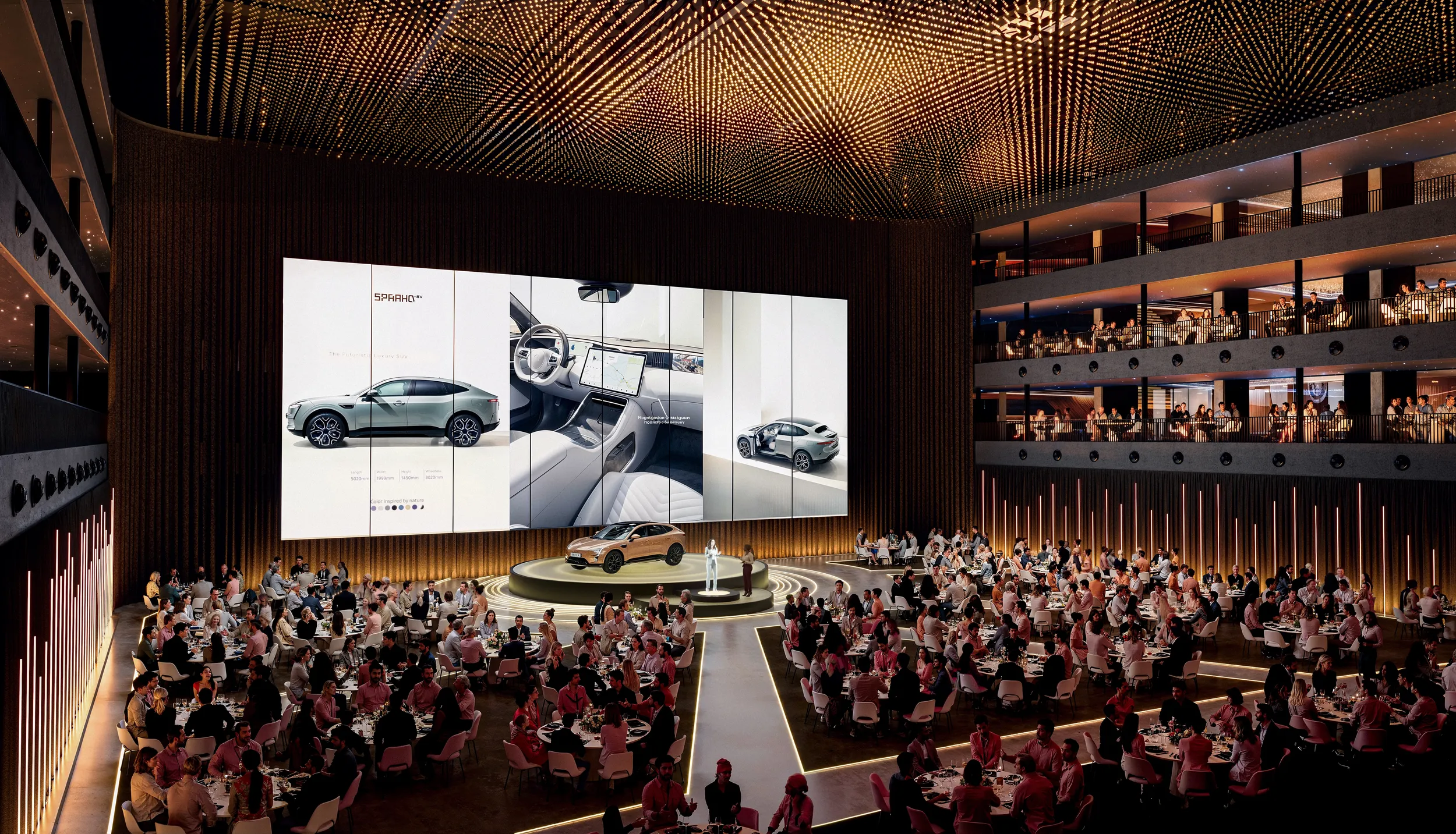 Large event hall with guests seated at round tables around a central stage where a car is being presented, surrounded by tall digital screens and multiple balcony levels with spectators.